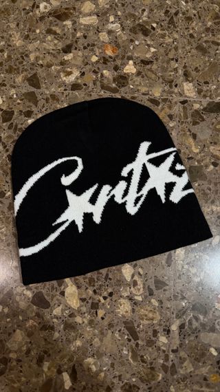Gorro de la marca Corteiz con un diseño llamativo. - Color negro con logo blanco. - Tejido de punto.