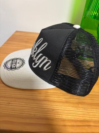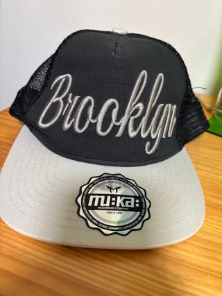 Gorra estilo trucker con el nombre Brooklyn bordado en la parte frontal. La marca Muka es visible en la etiqueta. - Diseño de malla en los laterales y la parte trasera. - Visera plana. - Cierre ajustable.