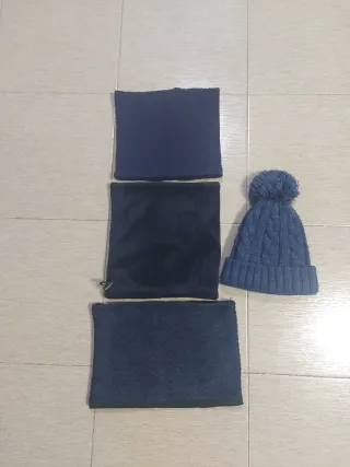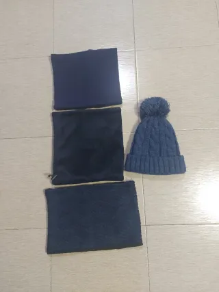 Conjunto de accesorios de invierno para niño. - Gorro de punto trenzado con pompón. - Dos bufandas o cuellos de lana. - Una bufanda lisa y otra con textura.