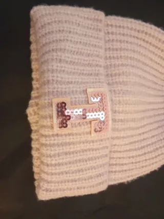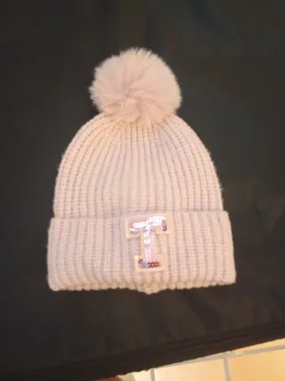 Gorro de lana suave con un pompón decorativo en la parte superior. Presenta un detalle de lentejuelas en forma de letra. - Diseño de punto acanalado. - Pompón de pelo sintético. - Adorno de lentejuelas en la parte frontal.