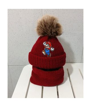 Conjunto de gorro y cuello de tejido a mano - Gorro con pompón grande extraíble. - Cuello a juego. - Diseño de Mario Bros bordado en el gorro.