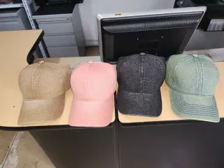 Lote de cuatro gorras de tela con un diseño clásico. - Gorra color beige. - Gorra color rosa. Azul - Gorra color negro. - Gorra color verde.