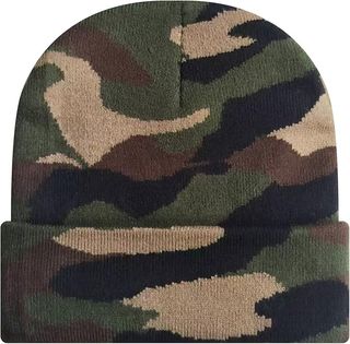 Gorro de punto con estampado de camuflaje. - Tejido de punto suave, 100% acrílico - Tamaño sin doblar: 20 cm de ancho * 28 cm de alto, doblado: 20 cm de ancho * 20 cm de alto.