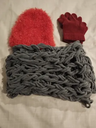 Lote de accesorios de invierno. - Gorro de punto con toques brillantes, color coral, muy elástico. - Guantes de punto color granate, tacto suave, melocotón. Bufanda de hilo grueso, tejida a mano, color gris, tacto muy suave. Todo en buen estado, medidas aproximadas en las fotos