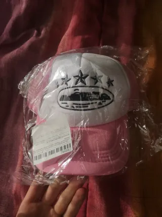 Gorra de la marca Corteiz con un diseño llamativo. - Parte frontal blanca con detalles negros. - Malla trasera y visera en color rosa. - Estrellas y logo en la parte frontal.