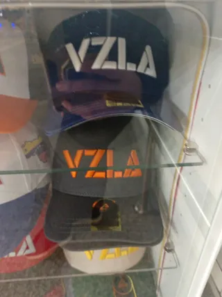 Lote de gorras de la marca VZLA. - Gorra blanca con visera naranja y logo VZLA en negro. - Gorra blanca y azul con logo VZLA en rojo y etiqueta oficial. - Gorra azul marino. - Gorra blanca con logo VZLA en amarillo.