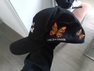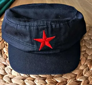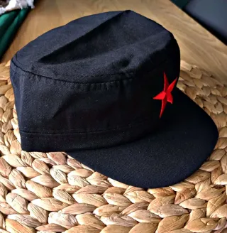 Gorra negra estilo militar traida personalmente por mi y mi hijo desde Santa Clara, Cuba, en el año 2021. Solo fue usada alli para hacer unas cuantas fotos, luego ha estado expuesta en una estanteria este tiempo, no se volvió a usar como gorra, está nueva. Longitud del ala de la gorra: 6,5 cm. Altitud de la gorra: 10 cm Material: algodón poliéster Circunferencia de la gorra: 56-58 cm (ajustable) - Color negro. - Adorno de la estrella roja en la parte frontal de la gorra, no es un parche, es una estrella tejida con hilo rojo.