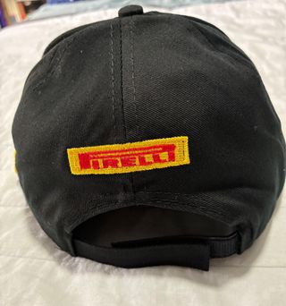 Gorra de la marca Pirelli con un diseño llamativo. - Parche frontal con el logo de Pirelli en amarillo y rojo. - Bordado de hojas doradas en la visera. - Color principal negro.