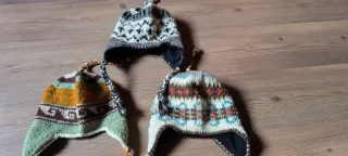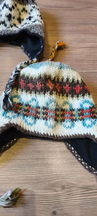 Gorro de lana tejido a mano con un diseño vibrante y llamativo. Perfecto para mantenerte abrigado con estilo. Gorros de lana con foto polar por dentro. Madre in Nepal Nuevos. Los tres 18€ Uno 8€ - Tejido de lana suave y cálido. - Diseño con trenzas y pompones. - Estampado geométrico tradicional.