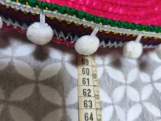 Sombrero mexicano de estilo tradicional, perfecto para fiestas o disfraces. - Color rosa vibrante. - Adornado con pequeños pompones blancos en el borde. - Detalle de cinta multicolor en la base de la copa.