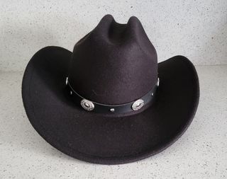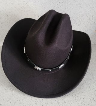 • Sombrero estilo cowboy negro ,fabricado en tela de fieltro de alta calidad. • Banda decorativa de polipiel con monedas plateadas que se puede poner y quitar. • Diseño clásico de ala ancha. • Las medidas son: Circunferencia de la cabeza 57 a 59 cm, Altura 12 cm, Ancho máximo 33 cm, Largo 35 cm. • Es ajustable: por dentro lleva una cuerdecita para ajustar y que no se mueva. • Unisex. • Dispongo de 2 unidades: uno 10 €, dos 18 €. • Hago envíos. También entrega en mano. • Protector de plástico para el envío.