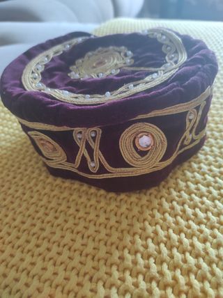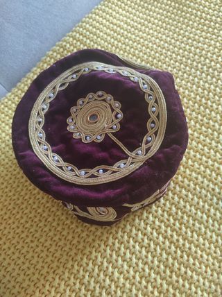 se trata de un "tubeteika", un sombrero tradicional kazajo uzbeco, que pueden usar tanto hombres como mujeres. Se compró en el Gran Bazar de Estambul, en 2010. Medidas: 18 cm. de diámetro y 6 cm. de altura Se encuentra prácticamente nuevo Puede usarse como prenda tradicional o conservarse como pieza de colección.