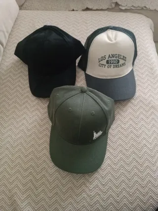 Conjunto de tres gorras para hombre. Talla 58,59 - Gorra negra. - Gorra verde con diseño. - Gorra tipo trucker con texto 'Los Angeles City of Dreams'.