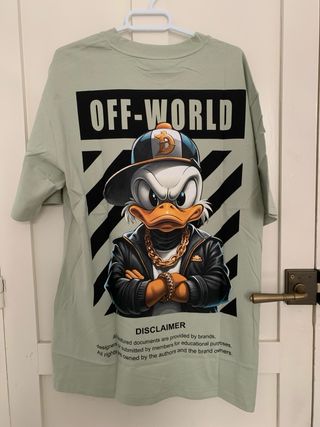 Totalmente nueva con su etiqueta , mas modelos en mi perfil , tallas disponibles: M , L , S y XL - Estampado frontal de un pato con gorra y cadena. - Inscripción OFF-WORLD en la parte superior del estampado. - Cuello redondo.