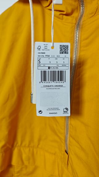 Chaqueta ligera utilitaria de algodón de Mango, color amarillo. Talla S. Está completamente nueva sin estrenar. Tene gorro para proteger de lluvia y viento y cuerdas para ajustar bien al cuerpo.