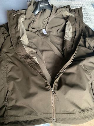 Chaqueta para actividades al aire libre, impermeable y transpirable; tipo “3 en 1”; con gorro tanto capa externa como interna; ésta va integrada y es tipo polar. Color verde. Talla XL. Marca Tribord.