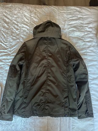 Parka de caballero talla 42 color verde oscuro es como impermeable tiene gorro y bolsillos.