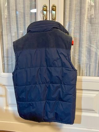 Chaleco acolchado sin mangas con forro interior. - Cuello alto. - Cierre de botones. - Bolsillos laterales. - Detalle de pana en el cuello y hombros. - cremallera en cuello con gorro para lluvia La talla es S, aunque es amplia como para una m