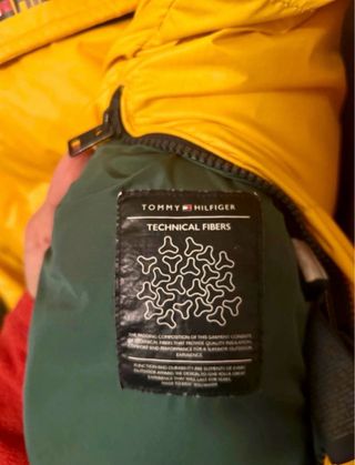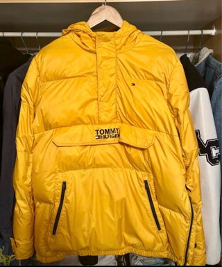 Chaqueta acolchada de la marca Tommy Hilfiger en color amarillo. MEDIDAS: largo 70 cm axilas 50 cm - Diseño con capucha. - Bolsillo frontal tipo canguro. - Cremalleras en los bolsillos laterales. !!! Unas manchitas en el gorro ( ver última foto)