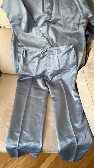 Conjunto de traje tradicional malayo. Tela tipo raso (traje) y terciopelo (gorro). - Incluye camisa (49 cm de hombros y 75 de largo) y pantalón (cintura 46, contorno 92 cm, largo de 100 cm). - Gorro azul marino de terciopelo a juego. (15x22,5 cm)