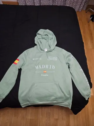 Sudadera color verde con capucha talla M , a estrenar[ Sin uso]. Lleva logotipo de la bandera de España en pecho y mangas, y la palabra " Madrid" en distintos tamaños tanto en pecho como en mangas. Cómoda, calentita y con estilo urbano y patriótico.