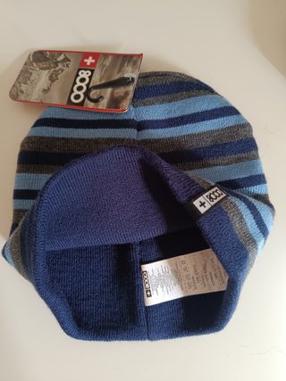 Gorro de punto con un diseño de rayas en tonos azules y grises. Es un accesorio cálido y cómodo. - Diseño de rayas horizontales. - Etiqueta de la marca en la parte inferior. - Nuevo, sin usar.