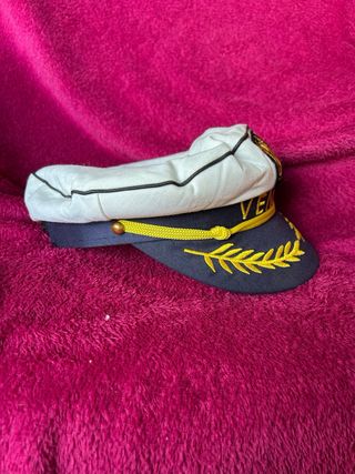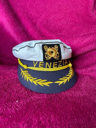 Gorra de marino con el nombre VENEZIA bordado. - Diseño con ancla dorada en la parte frontal. - Adorno de laurel dorado en la visera. Gorra de tela con visera con adornos dorados originales apropiado para disfraz. Medidas en las fotos. Adaptable con velcro por detrás. Se nota gastada la gomaespuma interior, de la gorra. No se ha usado.