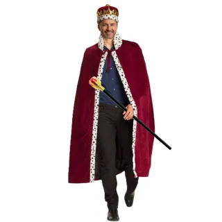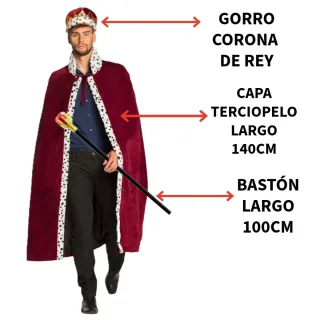 Conjunto de capa, gorro y bastón para disfraz de rey. Incluye 3 pcs - Capa de terciopelo burdeos 140cm - Gorro a juego con detalles dorados. - Bastón decorativo con piedra roja. Productos totalmente nuevos .
