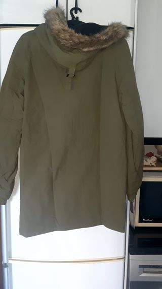 Chaquetón con gorro. Color caqui. Tiene varios bolsillos. Es acolchado. Está en perfecto estado. Mide 57 cm de ancho y 84 de largo