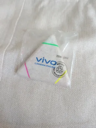 Bolsa de tela con un diseño veraniego de la marca Vivo. - Diseño con palmeras, sol y olas. - Estampado en color azul sobre fondo blanco. - Gorro de tela - Subrayador triangular de 3 colores