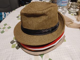 Dos gorros de paja para hombre, uno en tono beige y otro en marrón. - Gorro beige con cinta negra. - Gorro marrón con cinta de rayas. -Modelo de invierno y de verano -Como nuevo. -No tiene marcas ni roces. - El precio es de 10 euros los dos. -Se puede vender por separado a 5 euros cada uno. -El sombrero de invierno es de marca Primark -El de verano no le localizo marca