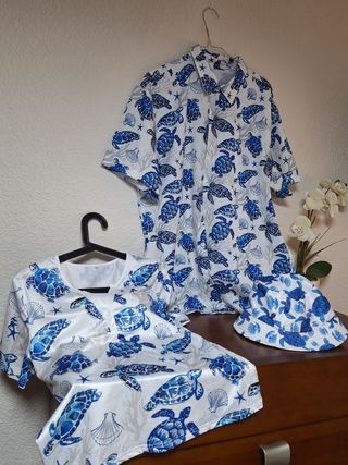 Preciosa colección de ropa de playa. Ideal para tus vacaciones. Camisa caballero talla xl y camiseta señora talla M con gorro unisex - Incluye una camisa de manga corta, una camiseta y un gorro a juego. - Estampados preciosos de tortugas marinas. - Diseño alegre y veraniego. - Perfecto estado.