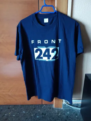 Camiseta azul marino de manga corta con logo frontal del grupo Front 242. Fabricada en algodón. Buena textura y calidad. Nueva a estrenar. Tengo otras camisetas y gorros chulos en mi perfil.