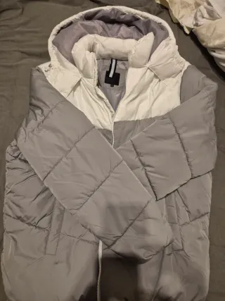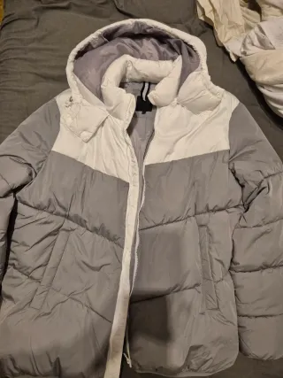 Abrigo de invierno de C&A con gorro. - Diseño acolchado. - Combinación de colores gris y blanco.