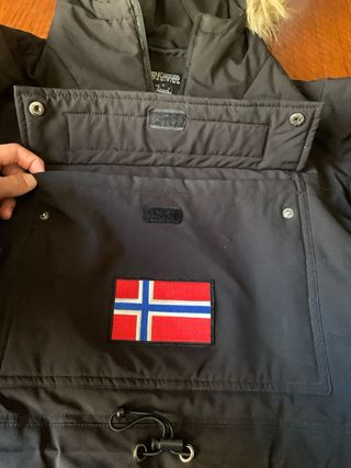 Abrigo Norway caliente y original. Tiene dos bolsillos normales y otro a la altura del pecho. Su gorro con pelo se puede quitar. Esta en muy buen estado, siendo que no lo hemos usado mucho.