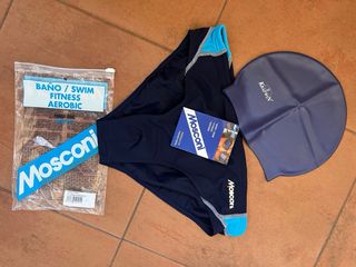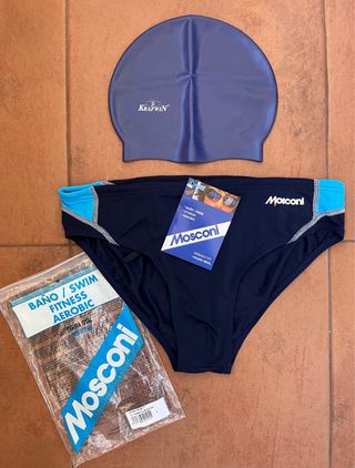 Bañador de competición MOSCONI talla L y gorro de silicona KRAFWIN, nuevos con etiquetas