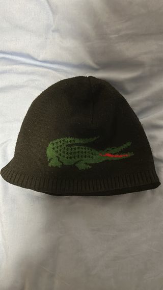 Conjunto de gorro y bufanda Lacoste de punto. Ambos son de color negro y presentan un parche con el cocodrilo de la marca. El gorro es de estilo beanie. Son artículos nuevos con etiquetas. - Incluye gorro y bufanda. - Material de lana. - Parche bordado con el logo de Lacoste.