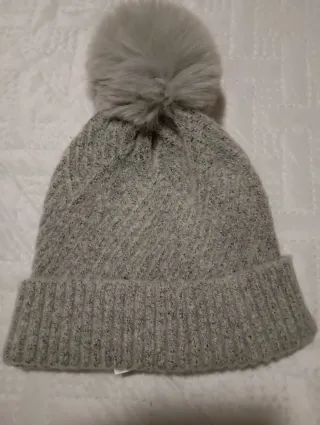 Conjunto de dos gorros gris de lana: uno estilo boina, con diseño trenzado y, otro con líneas de brillo, pompón blanco y tejido interior de pelo. Boina de Primark, solo un uso, gorro de pompón de Sfera nuevo con etiqueta.