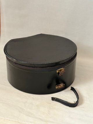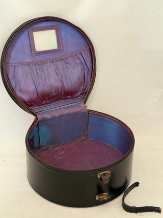 Preciosa sombrerera antigua de piel. Ideal para guardar sombreros con estilo. Tiene un espejo interior y forro morado. La asa está un poco dañada, como se ve en las fotos. - Piel negra. - Forro interior morado. - Cierre con cremallera. - Espejo interior. Medidas: 36 centimetros de diametro por 15 centimetros de alto. Se hacen envios
