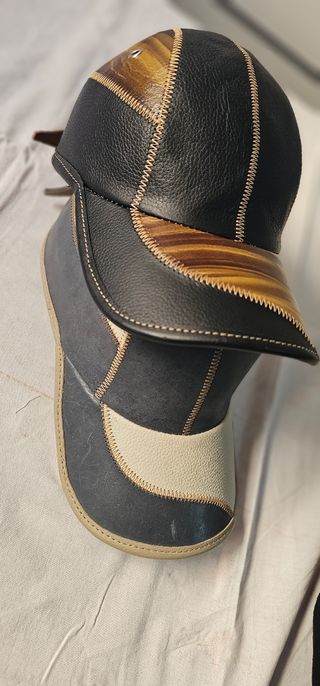 Gorra de diseño único con paneles de cuero. - Combinación de cuero negro y azul. - Detalles en cuero con acabado de madera. - Costuras visibles en contraste. PIEL AUTÉNTICA Precio por unidad
