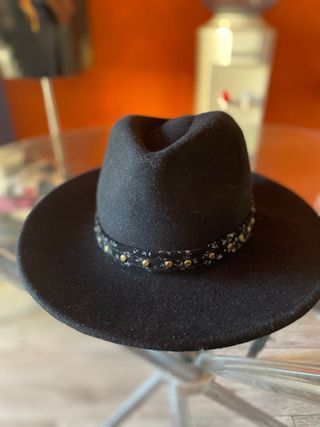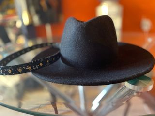 VER FOTOS ANTES DE COMPRAR Sombrero de fieltro negro con un diseño moderno. - Talla: 54/56 - Detalle de cinto de piel genuina de oveja decorado con tachuelas doradas y estampado floral.