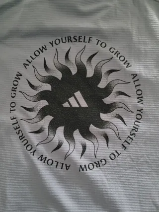 Sudadera Adidas de entretiempo con un diseño circular en las espalda inspirado en el sol y la frase ALLOW YOURSELF TO GROW. - con etiqueta. - Color morado grisaceo. - Medidas en las fotos. - Diseño Yoga con gorro.