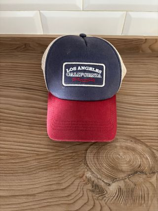 Gorra estilo trucker con diseño de Los Angeles, California. - Parte frontal azul marino. - Malla trasera color beige. - Visera y parte frontal en color rojo.