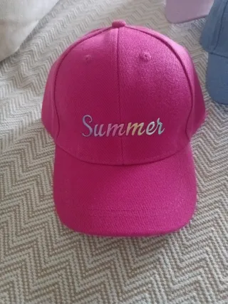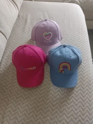 Lote de tres gorras infantiles con diseños divertidos. - Gorra rosa con bordado Summer. - Gorra lila con corazón y texto love life. - Gorra azul con diseño de arcoíris. Talla 54/55