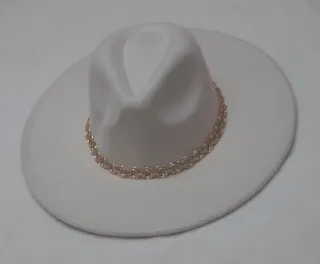 Elegante sombrero de vestir para mujer, con un diseño moderno y sofisticado. Su talla es ajustable para adaptarse cómodamente. - Adorno de cadena dorada alrededor de la base. - Material de fieltro suave al tacto. Recogida en mano.