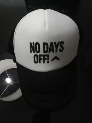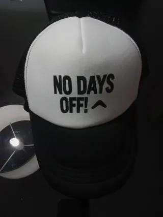 Gorra estilo trucker con un diseño llamativo. - Parte frontal blanca con texto negro. - Malla trasera negra. - Cierre ajustable.