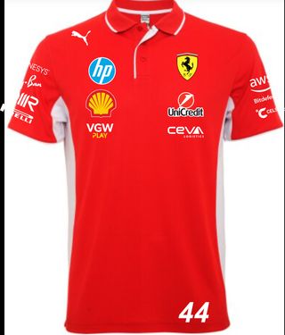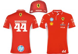 Conjunto de polo y gorra de Ferrari con el número 44 y el nombre Hamilton. - Polo rojo con detalles blancos y logos de patrocinadores. - Gorra roja con el escudo de Ferrari y el nombre Hamilton.
