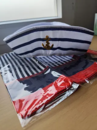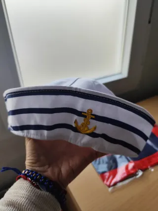 Conjunto marinero con gorro y pañuelo a juego. - Gorro marinero con ancla dorada. - Pañuelo con rayas marineras y detalles en rojo y azul. Dispongo de dos