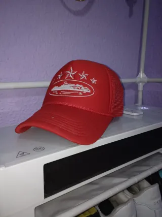 Gorra de la marca Corteiz. - Diseño con logo bordado. - Estilo trucker con paneles de malla.