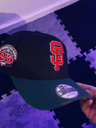 Gorra de béisbol conmemorativa de los San Francisco Giants. - Diseño de dos tonos en negro y verde azulado. - Parche del 25 aniversario en el lateral. - Logo SF bordado en la parte delantera. - Detalle FAM. en la parte superior.